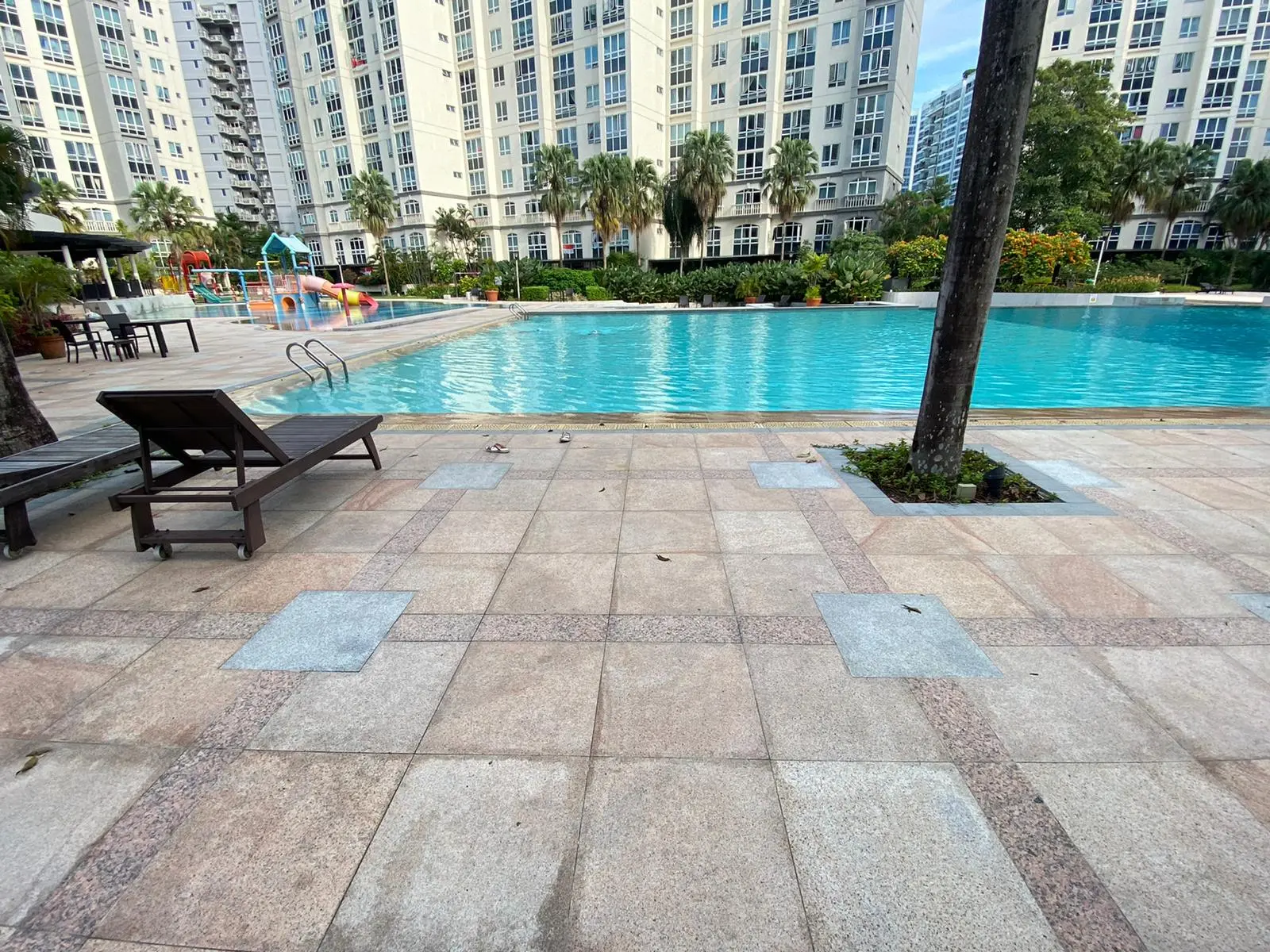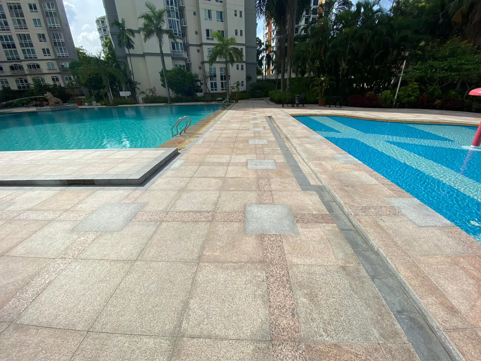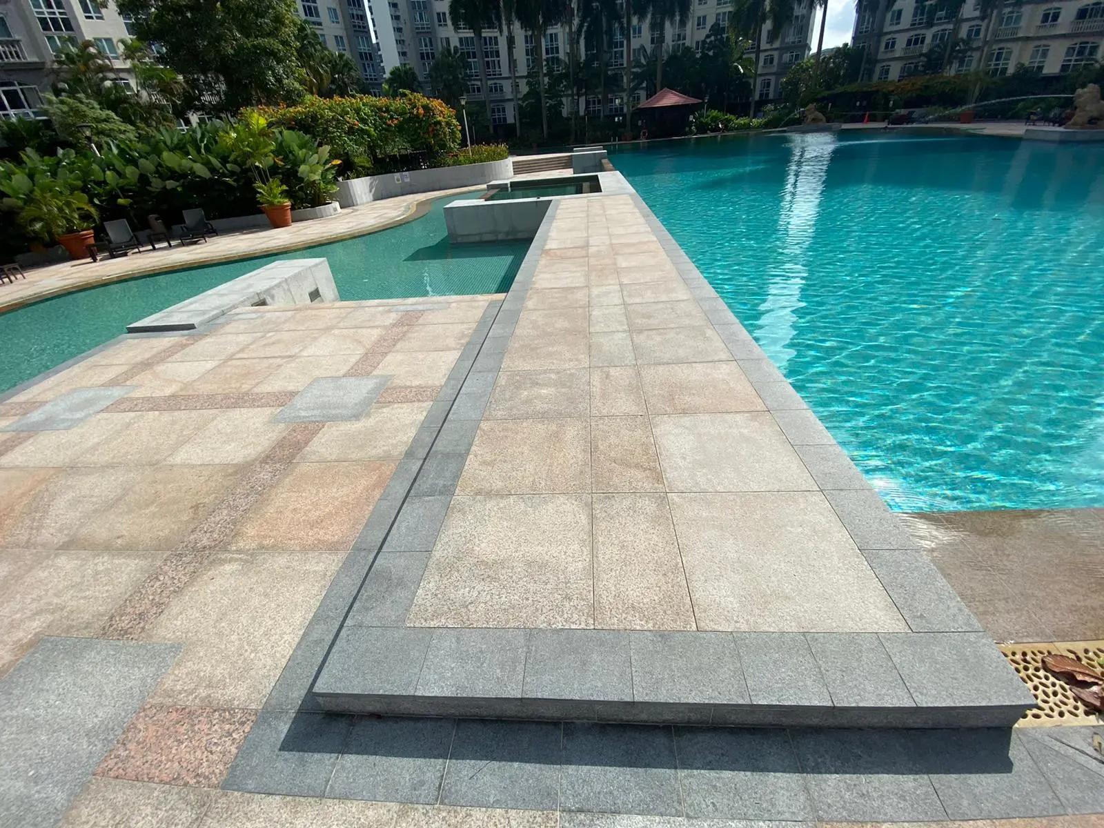 Our scope of work includes repointing and re-waterproofing the swimming pool, hacking existing pool deck tiles, and performing screeding, re-tiling, and re-waterproofing to the pool deck and common areas using high-quality granite stone for a durable and polished finish.