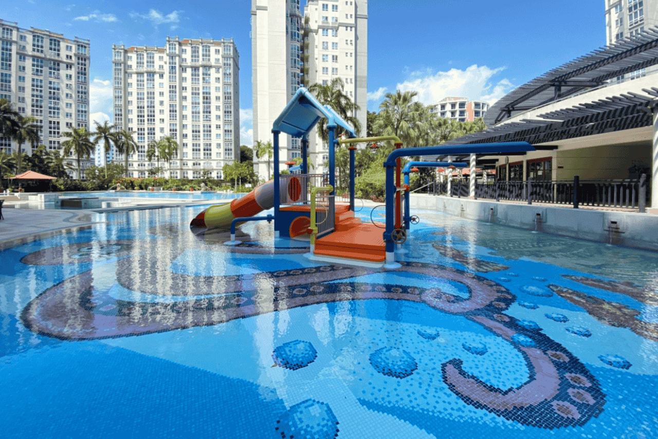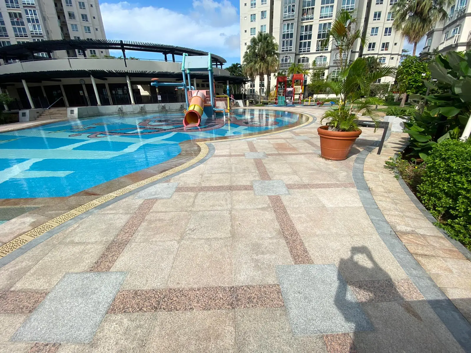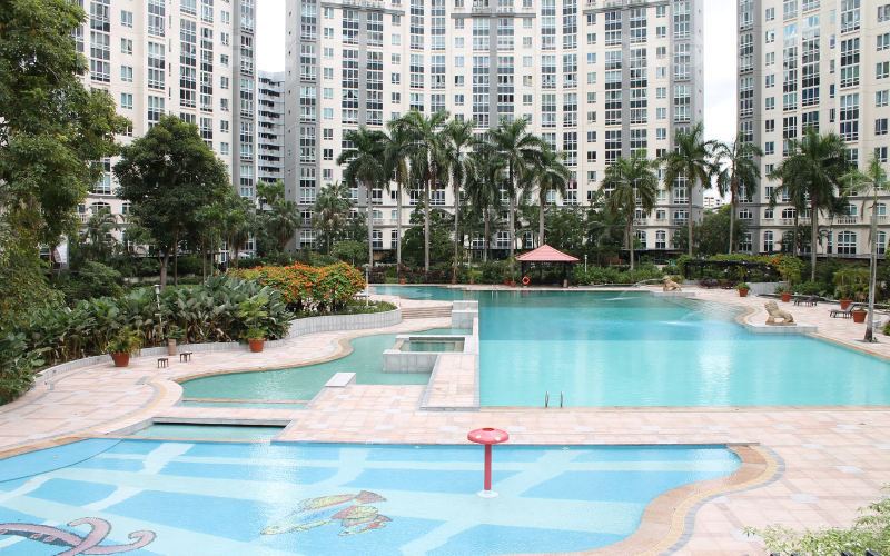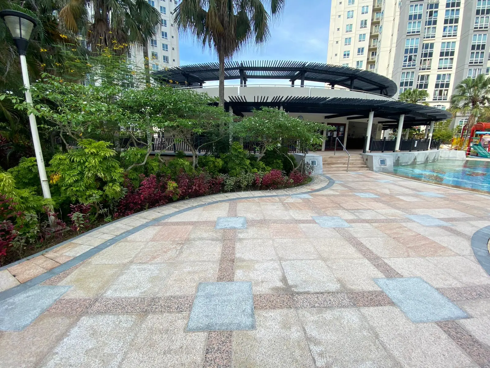 Our scope of work includes repointing and re-waterproofing the swimming pool, hacking existing pool deck tiles, and performing screeding, re-tiling, and re-waterproofing to the pool deck and common areas using high-quality granite stone for a durable and polished finish.